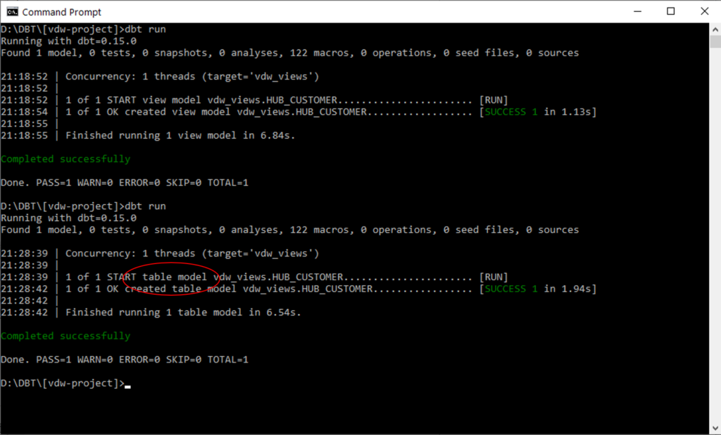 This can, of course, be generated again by VDW but the best approach is to configure this in the DBT project configuration. In any case, when we make this change and run again, DBT detects this and changes the model type to ‘table’.