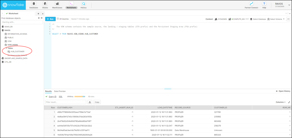 When we look in the Snowflake database, we can see that a view ‘HUB_CUSTOMER’ has indeed been created. A first step towards a Virtual Data Warehouse on Snowflake.