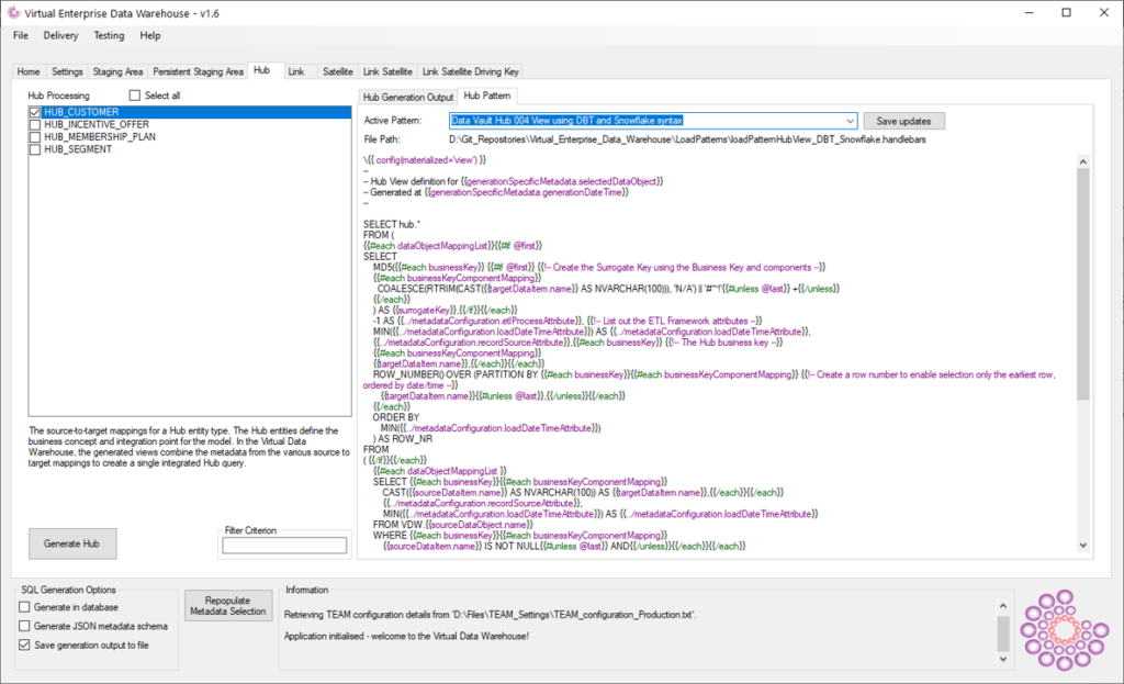 The image above shows that VDW has been configured to write the generated output to the ‘100_integration’ directory (output path). Also, I have added a ‘Data Vault Hub 004 View using DBT and Snowflake’ pattern to be configured as template for DBT / Snowflake code generation.
