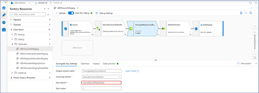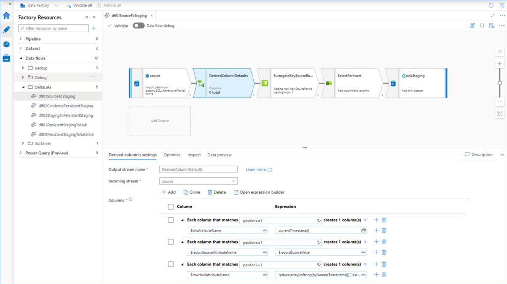 The screenshot shown above shows the data as it connects to the AdventureWorks ‘Customer’ table, selects the columns found there and adds the three dynamic columns ‘LoadDateTimeStamp’, ‘RecordSource’ and ‘RowHash’ as per the parameter values.