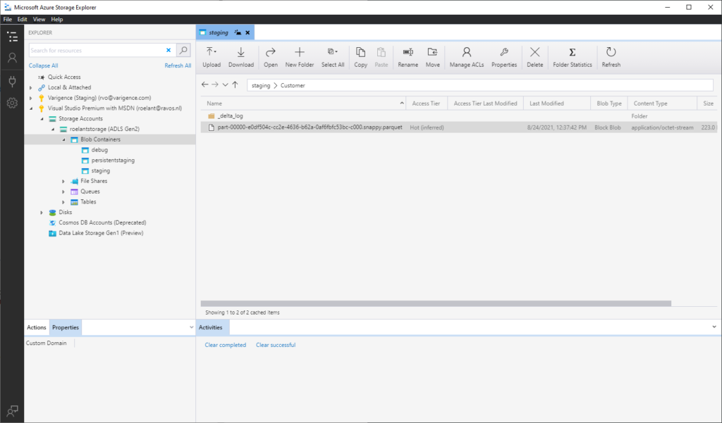 The data that is ultimately written (in parquet format) is visible on the Data Lake storage account. A directory will be created following the parameters specified for the Sink if it does not already exists.