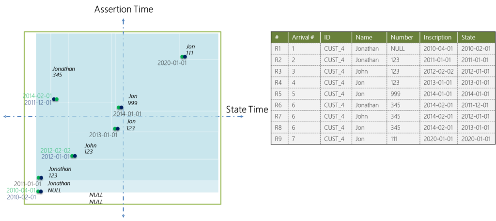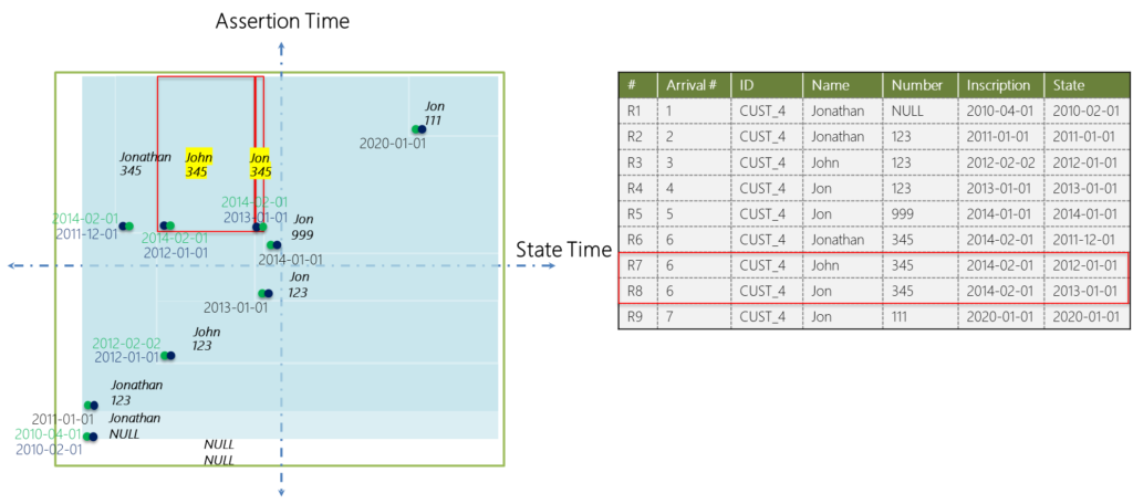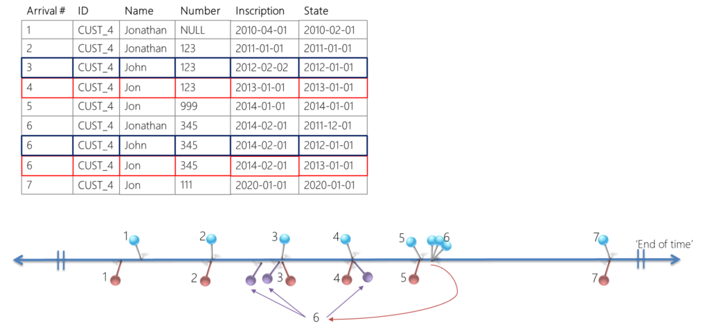 When bringing together these two tables, some very interesting things happened. The resulting combined data set shows two additional records which weren’t visible before in the individual tables. These two records represent a correction on the state timeline, the ‘functional’, or ‘business’ timeline that represents the real world.