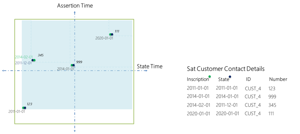 The question posited in the previous post was ‘how can the number value be ‘123’ and ‘345’ at 2012-01-01′? The answer, of course, depends on ‘as of’ when you’re looking at the data. Are you looking at it from today’s perspective (answer: 345), or from the perspective of two years ago (answer: 123).